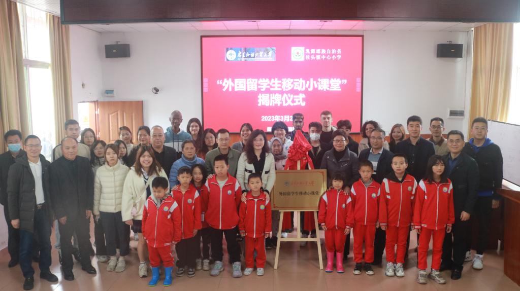 “广东外语外贸大学外国留学生移动小课堂”揭牌成立。小课堂旨在为我校外国留学生打开一扇了解中国的新窗口,也为桂头镇中心小学的孩子们打开一扇看向更广阔世界的窗口。