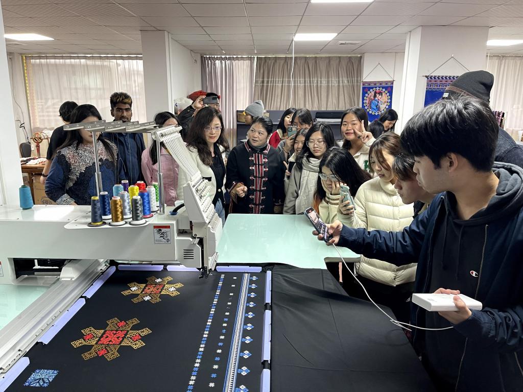 乳源瑶族自治县被誉为“世界过山瑶之乡”,为了解瑶族脱贫、乡村振兴情况,留学生走进瑶族自治乡镇必背镇。必背镇位于乳源县城北部约50公里的大瑶山腹地。盘山公路蜿蜒曲折,山间溪流潺潺,云雾缭绕。留学生还参观了乳源非遗文创孵化基地。赵馆长介绍了瑶绣等瑶族非物质文化遗产,并展示各类瑶族文化元素的文创产品。馆长还带领留学生来到生产作坊观看各类瑶绣织物的生产过程,向留学生们鲜活展示了乳源非遗文创将文化传承与经济发展相结合,产业振兴和文化振兴相结合的特色。