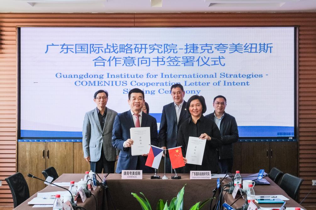 广东国际战略研究院执行院长李青与李以森分别代表广东国际战略研究院和捷克夸美纽斯,签署合作协议。