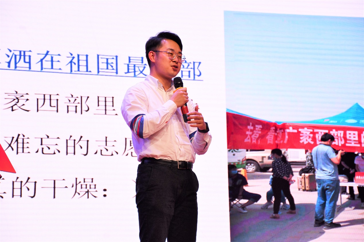 在新疆维吾尔自治区喀什地区从事基层社会治理岗位的志愿者伍云龙分享了许多基层工作经历。他满怀对祖国的热爱投身喀什的乡村振兴项目,积极参加疫情防控。伍云龙表示,这一年来他有两个最大的感受,青年要有理想,努力充实自己的精神世界;青年要主动历练,提升自己的综合素养。伍云龙鼓励同学们毕业后以热忱之心积极投身西部志愿服务,以青春之我谱写奉献之歌。