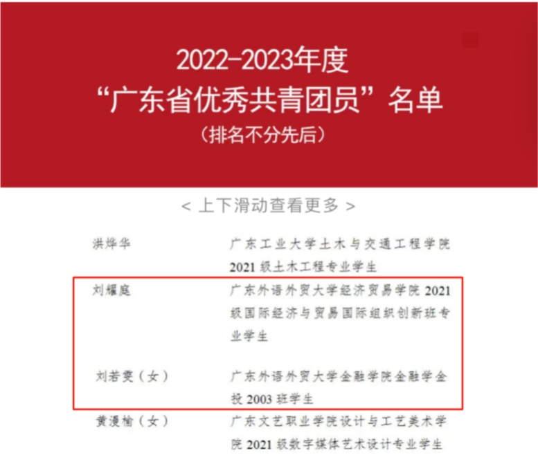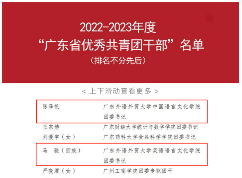 本网讯 2023年是全面贯彻落实党的二十大精神的开局之年。各级团组织和广大团员、团干部凝聚在党的旗帜下,牢记初心使命,充分发挥生力军和突击队作用,涌现出一大批先进典型。在今年五四青年节前夕,共青团中央、团广东省委分别作出表彰决定,表彰各级团组织和广大团员、团干部。其中,我校团委干事吴怡获“全国优秀共青团干部”称号,中文学院团委书记陈泽帆、英文学院团委书记马骁获“广东省优秀共青团干部” 称号,金融学院学子刘若雯、经贸学院学子刘耀庭获“广东省优秀共青团员”称号。