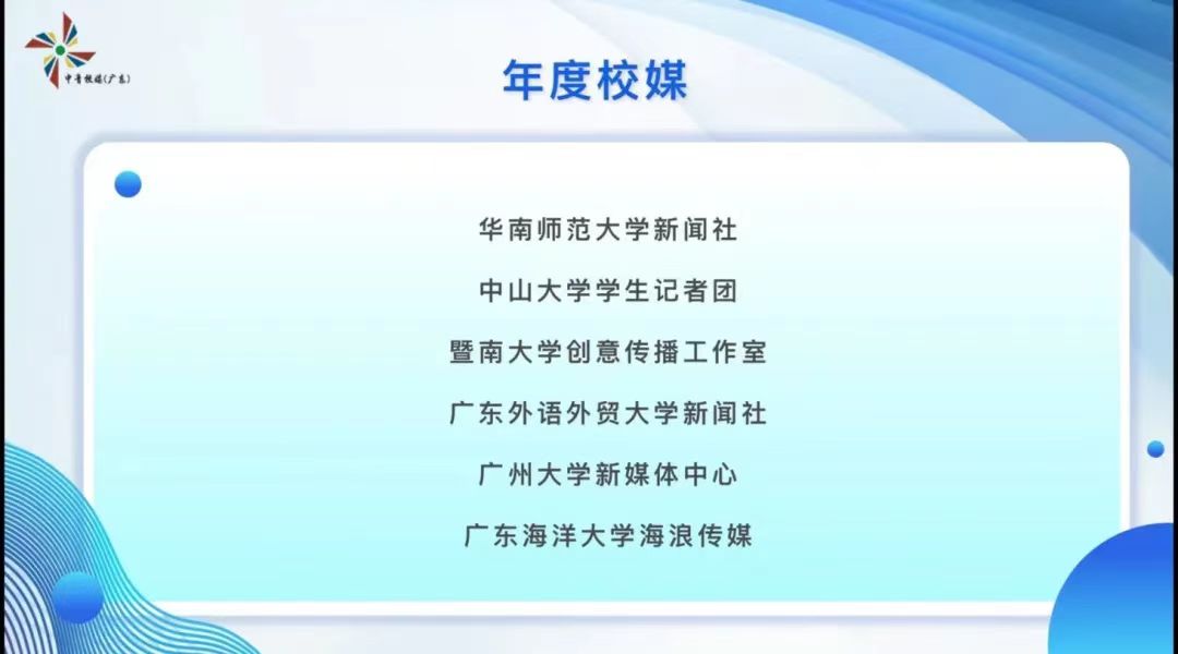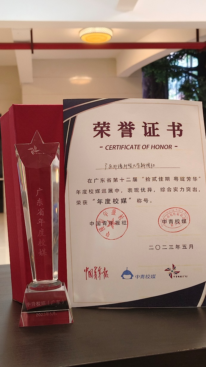 据悉,广东省第十二届“贰拾佳期 粤绽芳华”年度校媒巡展于2022年12月至今年5月开展,共56家校媒参与。活动包括网络巡展、线上作品交流会、校媒汇报展示等环节,最终12家校媒入选“年度校园媒体”。广外新闻社于2002年成立,是隶属于广外党委宣传部的新闻工作学生团队,协助做好广外新闻网、广外英文网、广外校报的新闻采编工作,创作并运营广外官方微信公众号、视频号、抖音、B站的原创内容,秉承“做好新闻事业,交一生朋友”的宗旨,以高度的责任心和新闻敏锐性讲好广外故事。广外新闻社及服务的媒体曾获广东省优秀学生社团、广东省“十佳校媒”“十佳网站”“十佳校报”“十佳推文”等荣誉。