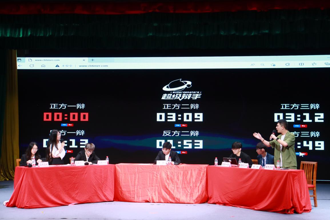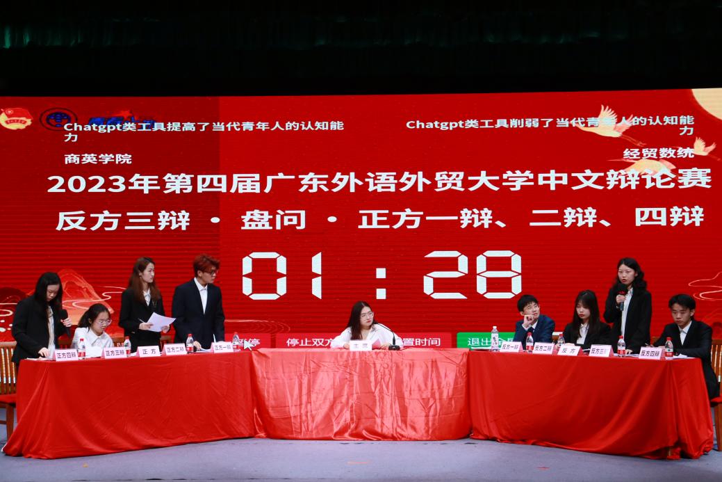 决赛的正方代表队是商英学院辩论队,其所持观点是“ChatGPT类工具提高了当代青年人的认知能力”。反方代表队是经贸数统学院辩论队,其所持观点是“ChatGPT类工具削弱了当代青年人的认知能力”。在双方简洁的自我介绍后,比赛正式开始。赛场上双方辩手的唇枪舌战,交锋激烈,给观众们带来了一场精彩绝伦的辩论盛宴。