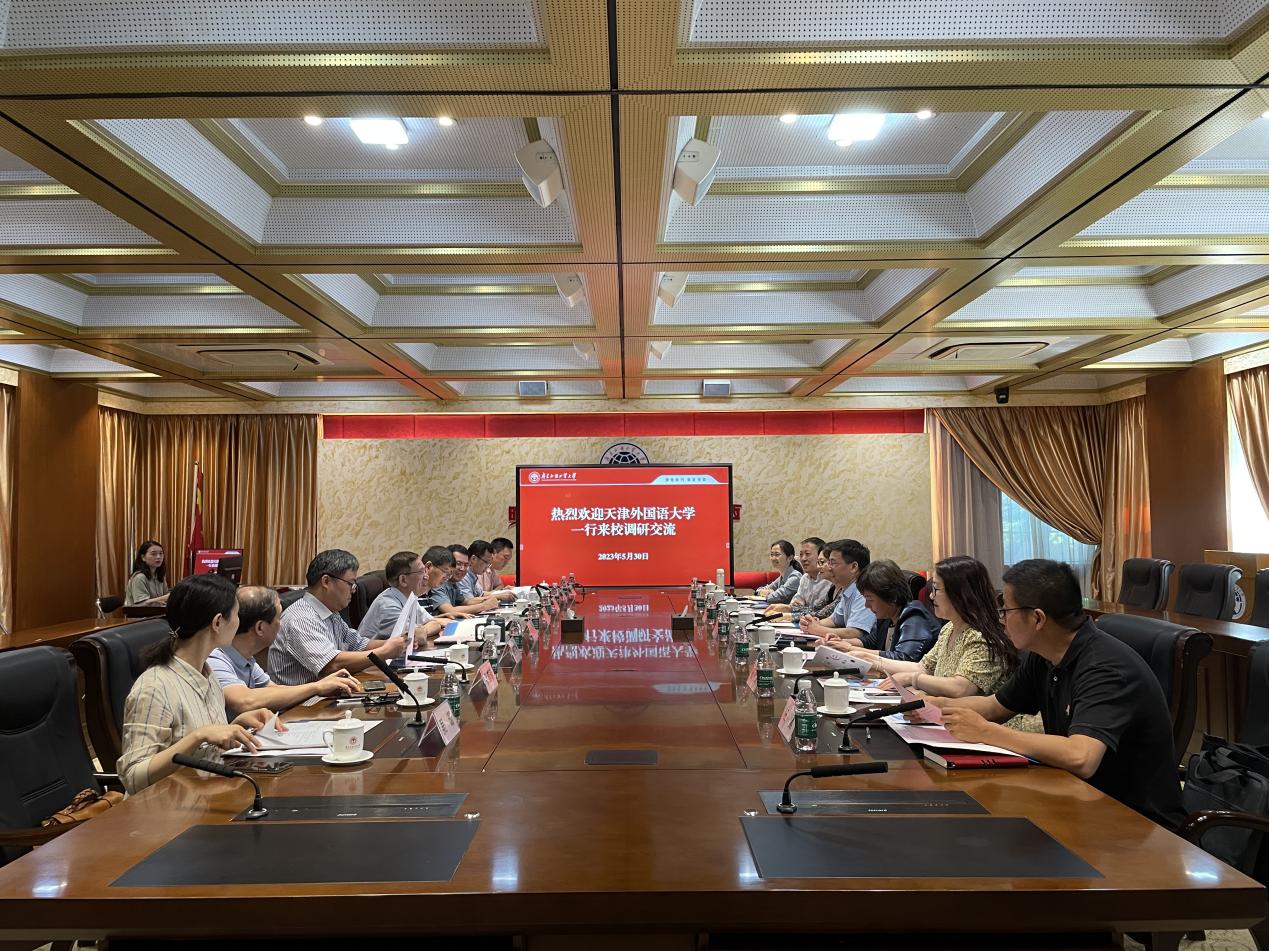 本网讯 近日,天津外国语大学党委副书记胡志刚一行7人来我校进行调研交流。我校副校长何传添会见来宾并主持调研座谈会。党办校办、发展规划部、教务部、研究生院、科研部和人力资源部(教师发展中心)等职能部门代表参加座谈交流。