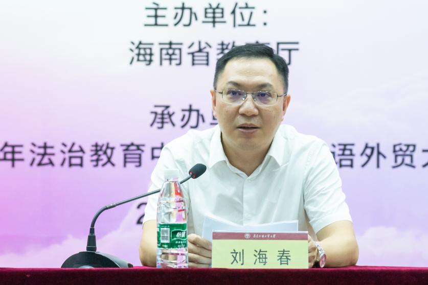 刘海春对我校基本情况和青少年法治教育中心工作情况进行了简单介绍,强调要积极发挥我校国际化特色、外语和法学优势,加强与海南合作,为推进海南校园法治建设和法治教育活动开展、培养更多海南优秀学子打好基础。