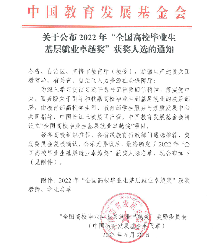 本网讯 近日,教育部高校学生司公布了2022年“全国高校毕业生基层就业卓越奖”获奖人选名单。经逐级推荐评选,我校毕业生邵书琴荣获2022年度“全国高校毕业生基层就业卓越奖”。