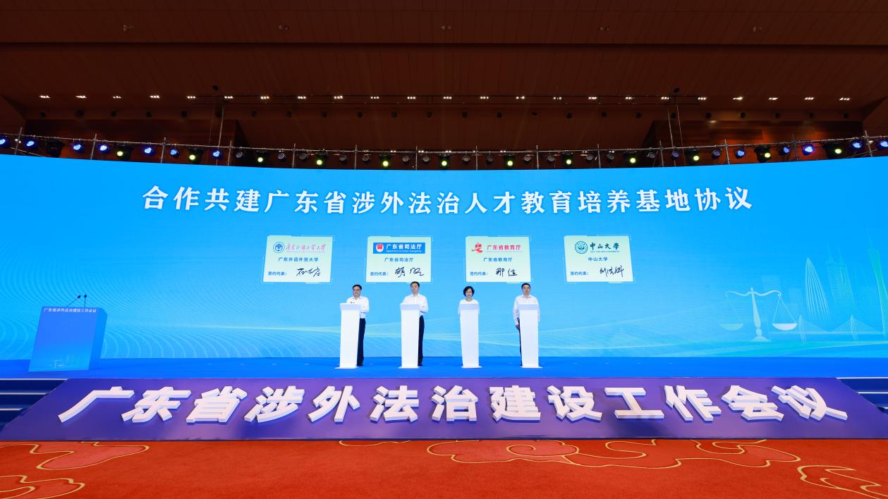 为整合各方优势资源,积极打造服务国家涉外法治战略和广东高水平对外开放的涉外法治人才培养基地,省司法厅、教育厅与广外签署《合作共建广东省涉外法治人才教育培养基地协议》,省法院与广外签署《涉外法治人才协同培养创新基地共建合作协议》。