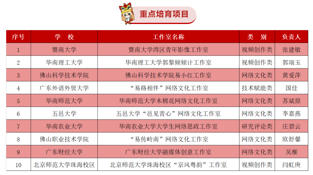 据悉,此次广东高校网络文化示范工作室培育建设立项是为贯彻落实教育部思想政治工作司2023年工作要求,深入学习习近平新时代中国特色社会主义思想和党的二十大精神,结合《关于开展广东高校网络文化示范工作室(第三批)培育建设工作的通知》(粤网络思政中心函〔2023〕10号)的要求,全省高校高度重视网络文化工作室培育建设。经个人申报、高校推荐、广东高校网络思想政治工作中心组织专家评审,确定重点培育项目10个,共建培育项目12个。