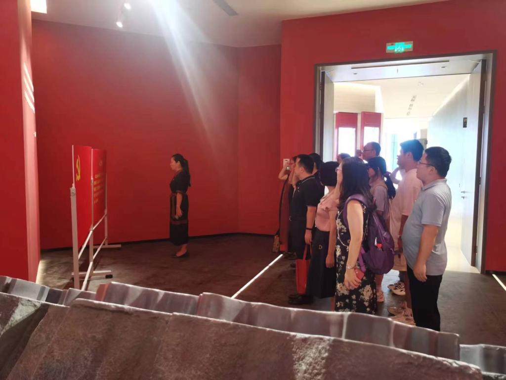 在馆内,师生党员面向鲜艳的中国共产党党旗,举起右拳,重温入党誓词。现场宣誓声铿锵有力,久久回荡。