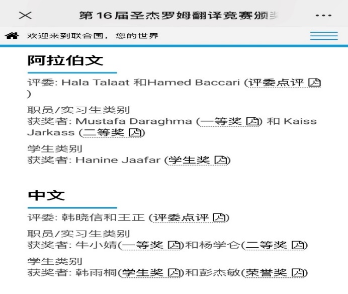 第16届联合国圣杰罗姆翻译竞赛获奖名单截图