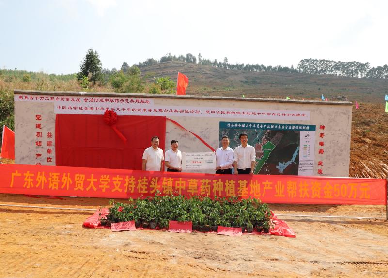 本网讯 10月30日,省委外办-广外乡村振兴工作队联合桂头镇人民政府举办中草药种植项目启动暨种苗捐赠仪式,校委副书记李云明出席仪式,并代表学校向桂头镇捐赠50万元产业帮扶资金。