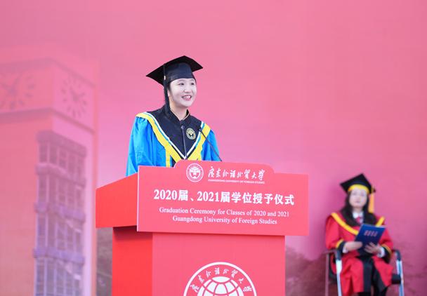 校友代表、新闻学院2020届毕业生王明哲在发言中感谢母校用一场盛大的告别仪式,为同学们人生中极具纪念意义的大学生活画上一个圆满的句号。他表示,在广外的求学时光有遇见、有尝试、有突破、更有收获,今后将始终秉持“卓越、诚信、包容、自信”的广外价值观,不断成长为更好的自己。