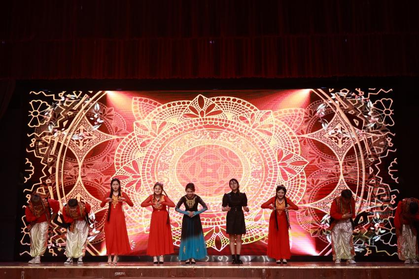 表演正式开始,来自不同民族的英教学子给我们带来了一场无与伦比的盛宴。《西域之火》把新疆少数民族的热情之花绽放。舞者裙摆翻飞,心应弦,手应鼓,步履手势变换之间,豪放热情尽显。一曲《不要怕》用彝族语言传递坚毅与勇敢的力量。歌声婉转温柔,让平和又坚定的力量浸润观众的心。虽语言不同,但情意相通。