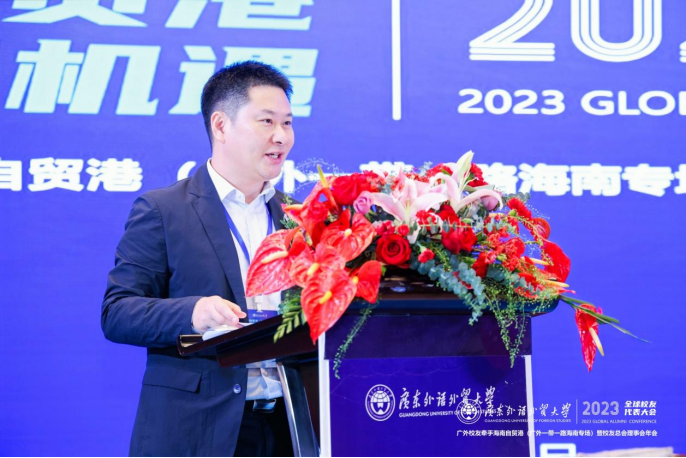 海南国际经济发展局杨善华副局长向与会嘉宾详细介绍了海南自贸港贸易自由便利政策。杨善华表示,海南自由贸易港是根据中央部署,在海南全岛建设的自由贸易试验区和中国特色自由贸易港,是党中央着眼于国际国内发展大局,统筹考虑作出的重大决策。伴随着自贸港建设的进程,海南政策向利向好发展,零关税、全岛封关、个税封顶15%等多项创新制度设计的推出,使得海南自贸港成为全球的焦点。杨善华诚挚希望广大欢迎广外校友搭乘海南大发展的东风,有所可为,有所作为,为促进中国式现代化发展作出更多广外贡献,并预祝本次活动取得圆满成功。