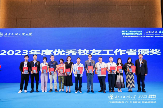 汇报过后,会议审议通过了广东外语外贸大学校友总会第五届理事会理事候选人名单。石佑启书记为三年来卸任的校友分会会长颁发聘书,为“广外金喇叭”获得者颁奖。