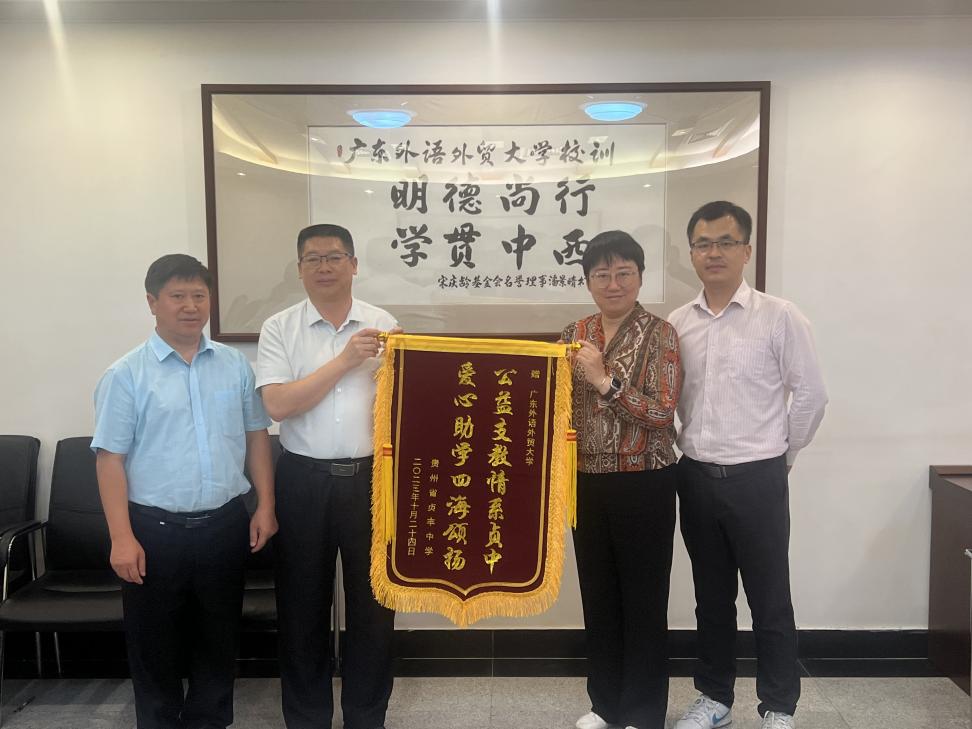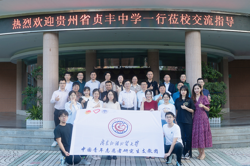 何传添向与会嘉宾介绍了我校与贞丰中学深厚的合作基础和研究生支教团的工作情况。他表示,研支团成员在贞丰中学开展为期一年的服务,他们的思想道德素养和个人综合能力均得到了极大的提升。在未来,两校要继续加强合作交流,鼓励更多广外学子赴贵州支教。