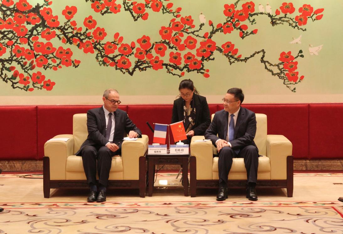 本网讯 3月13日下午,法国驻广州总领事馆总领事福希玮(M. Sylvain FOURRIERE)一行来访,法国克莱蒙商学院校长团队陪同来访,我校党委书记石佑启在白云山校区行政楼贵宾厅会见来宾。双方就人才培养、学科建设以及促进文化交流等事项交换意见。