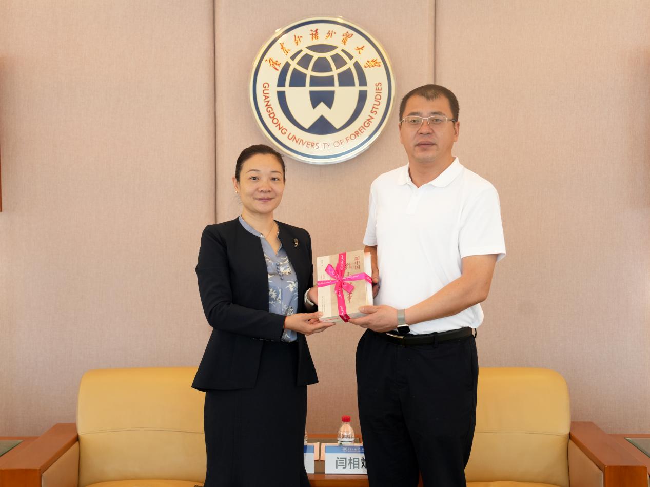谢粤参赞向我校赠送外交相关书籍,闫相斌校长代表学校接受赠书。