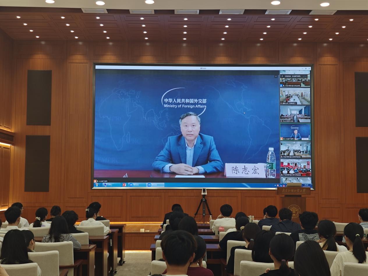 宣讲会上,中国驻马里大使、我校82级校友陈志宏通过线上连线方式,为同学们开展专题讲座。他结合近年来中国外交的发展历程,解读了当前的国际形势、全球发展面临的挑战,并强调了外交人员应忠于党、忠于国家、忠于人民,政治坚定、业务精湛、作风过硬、纪律严明等能力素质要求,希望大家坚定理想信念,努力学习专业知识,快速提升综合能力,为将来职业生涯打好坚实基础,鼓励和欢迎大家积极投身外交事业,实现人生目标。