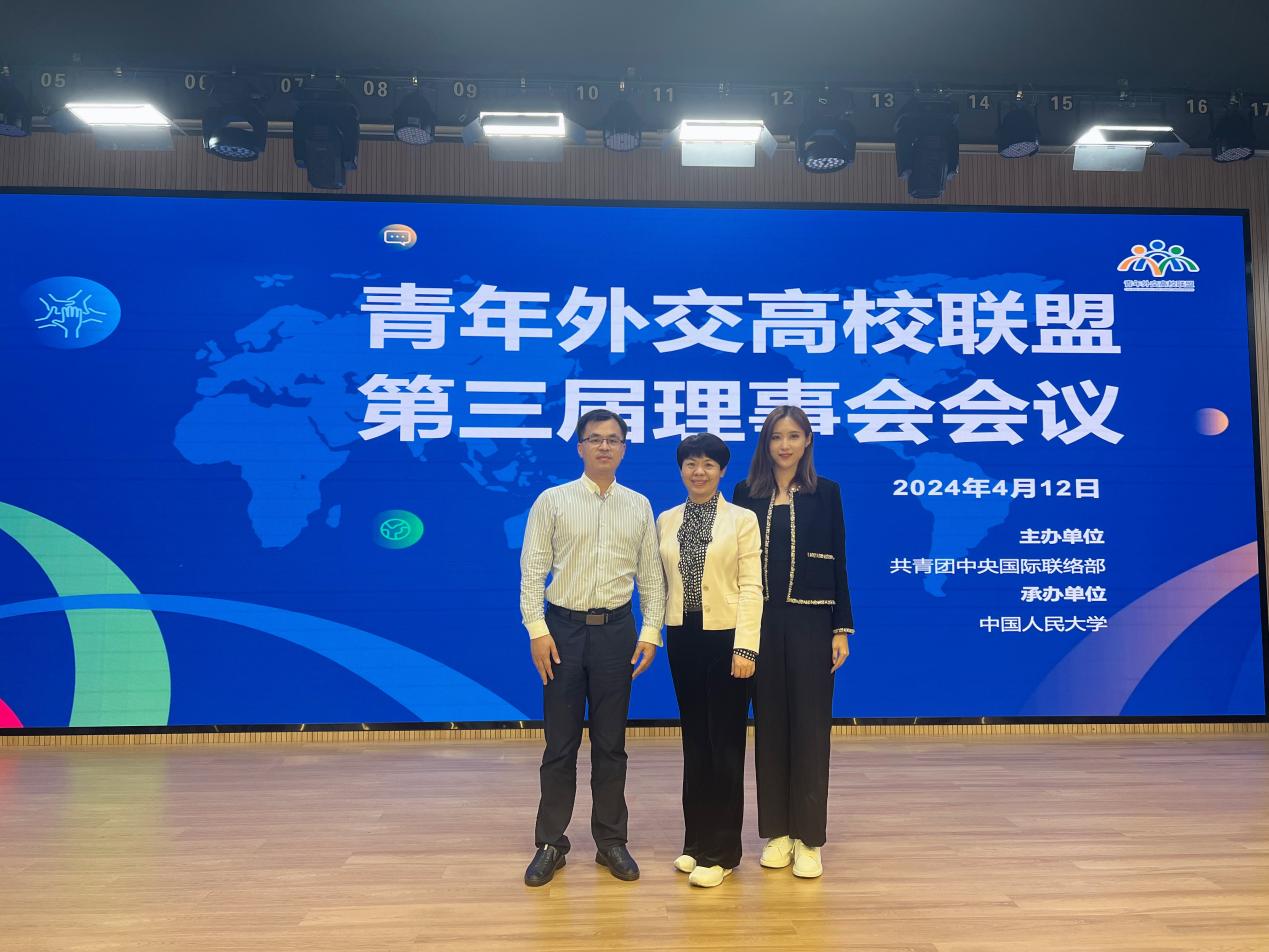 本网讯 4月12日,青年外交高校联盟第三届理事会会议在中国人民大学举办。共青团中央书记处常务书记徐晓,北京大学党委副书记、副校长、联盟第二届理事会理事长宁琦,中国人民大学党委常委、副校长、联盟第三届理事会理事长王易出席会议并致辞。北京大学、清华大学、北京外国语大学等联盟10所创始成员高校和12所新加入高校的理事、导师、专家和青年代表等80余人参加。我校团委书记刘郎、国际关系学院党委书记袁薇佳当选为理事,国际关系学院周龙老师入选专家团。
