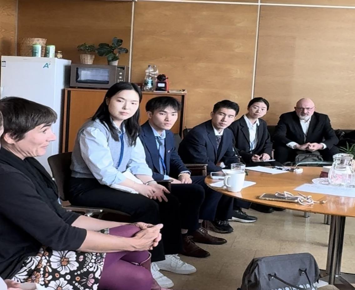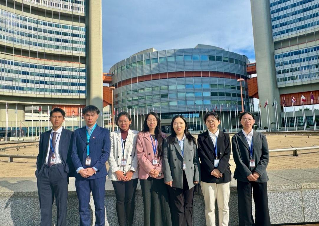 本网讯 根据我校与联合国签署的谅解备忘录框架协议及翻译学院国际会议传译证书班教学大纲要求,近日,由翻译学院副院长王丹带队,22级证书班韦俊杰、刘怡含、揭正琦、刘晓晨、黄诗妍、张宪达、肖雪莹七位同学在联合国维也纳办事处进行口译岗实习。本次实习的主要内容是观摩联合国会议及专业译员的工作方式,并进行会议同传哑箱训练。