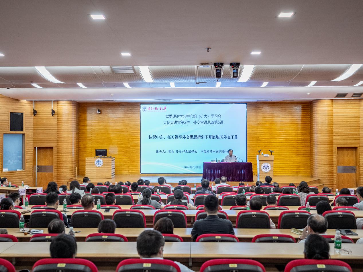 本网讯 5月8日,我校党委理论学习中心组(扩大)学习会暨大使大讲堂第2讲、外交官讲思政第5讲在白云山校区图书馆报告厅举行,深入学习习近平外交思想和习近平总书记关于总体国家安全观的重要论述。外交部原副部长、中国政府中东问题特使翟隽作专题辅导报告。我校党委书记石佑启主持学习会。广东省委外办原主任、我校非洲研究院创院院长傅朗,校领导,校党委理论学习中心组成员,学校副处职(级)以上干部,亚非语言文化学院、国际关系学院等有关单位党员师生代表参加学习会。