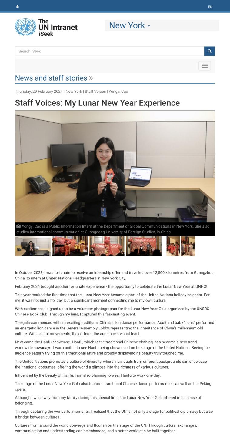 “今年是农历新年首次被列为联合国假日。于我而言,这不仅仅是一个假期,更是将我与自己的文化紧紧联系在一起的纽带。”今年二月,Staff Voices: My Lunar New Year Experience(员工心声:我的农历新年经历)在联合国网站发表,这篇文章由广外新闻与传播学院20级学生曹咏仪独立撰写,它也是联合国网站第一篇由中国实习生讲述“春节故事”的文章。