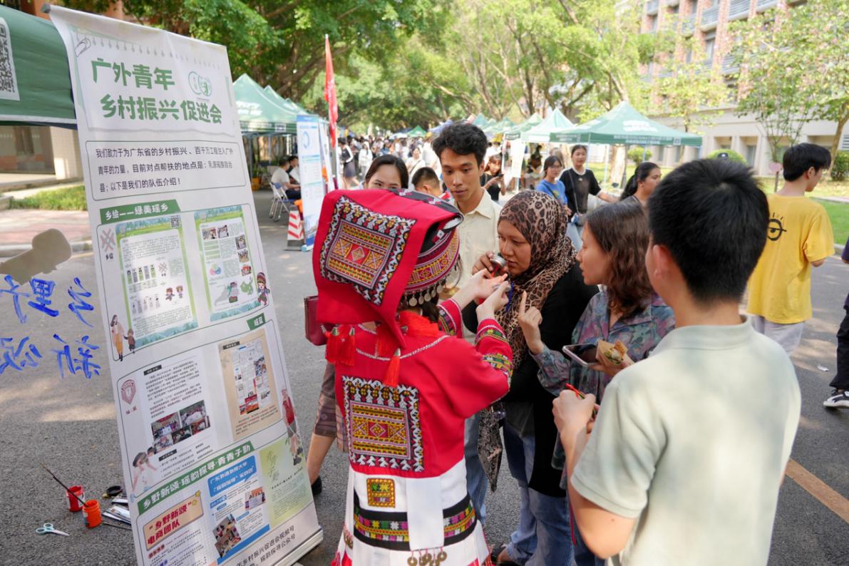 此外,亚非学院还联合双百行动服务队、广外青年乡村振兴促进会在文化节上设置摊位,推介韶关乳源文旅景点、瑶族服饰和瑶药非遗文化。让非遗文化助力乡村振兴,以青年力量赋能乡村振兴,以广外色彩点亮乡间田野。