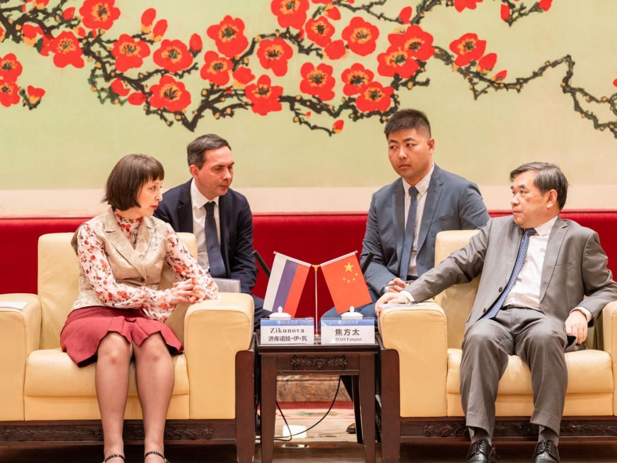 会谈中,焦方太向济库诺娃一行详细介绍了学校的历史沿革和办学特色。他指出,作为华南地区国际化人才培养的摇篮,我校在外国语言文学、全球经济治理、涉外法治研究及中华文化国际传播等领域具有广泛影响力。学校致力于推动国际交流与合作,不断提升师资、学生等多方面的国际化水平,并与俄罗斯乌拉尔联邦大学共同建设了孔子学院。他强调,济库诺娃主席的访问将为广外与俄罗斯高校之间的交流合作带来新的机遇。在全球化的浪潮下,他期待双方能够继续深化学术与文化交流,共同为推动中俄教育事业的发展贡献力量。