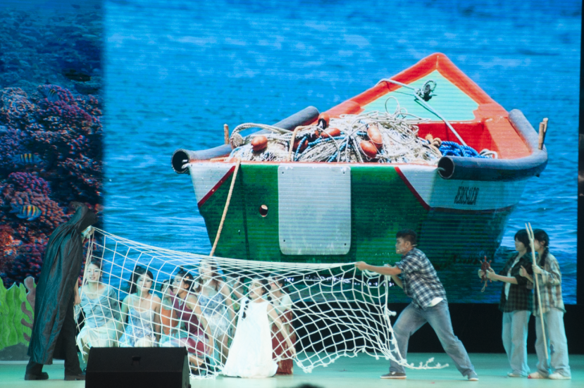 然而,就在Siana和朋友们即将把渔夫引向死亡礁石的那一刻,她看见了渔夫那无辜而纯真的女儿。怜悯让她的内心陷入了剧烈的挣扎。最终,她选择了放下复仇的执念,听从内心的声音,守护海洋的和平。音乐剧《希阿娜》作为本届戏剧大赛的新亮点,巧妙借由鱼类与人类的冲突,深刻揭露了海洋生态的恶化与工业资本主义下贪婪的肆虐。通过Siana的冒险,该剧展现了个人与集体、爱恨交织以及生死抉择的复杂情感,引发观众对自然生态的深刻反思。