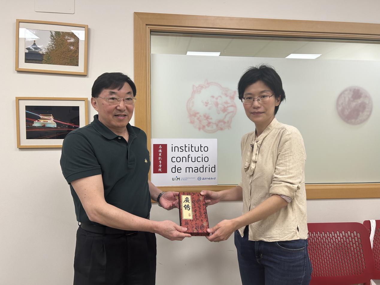 访问西班牙期间,李云明一行拜访了马德里孔院,并看望我校在马德里康普斯顿大学交流的学生。马德里孔院中方院长、上海外国语大学陆恺甜老师与代表团一行进行了交流,介绍了西班牙马德里孔院的办学经验,并探讨了与我校葡萄牙波尔图大学孔子学院进行师生交流的事项。
