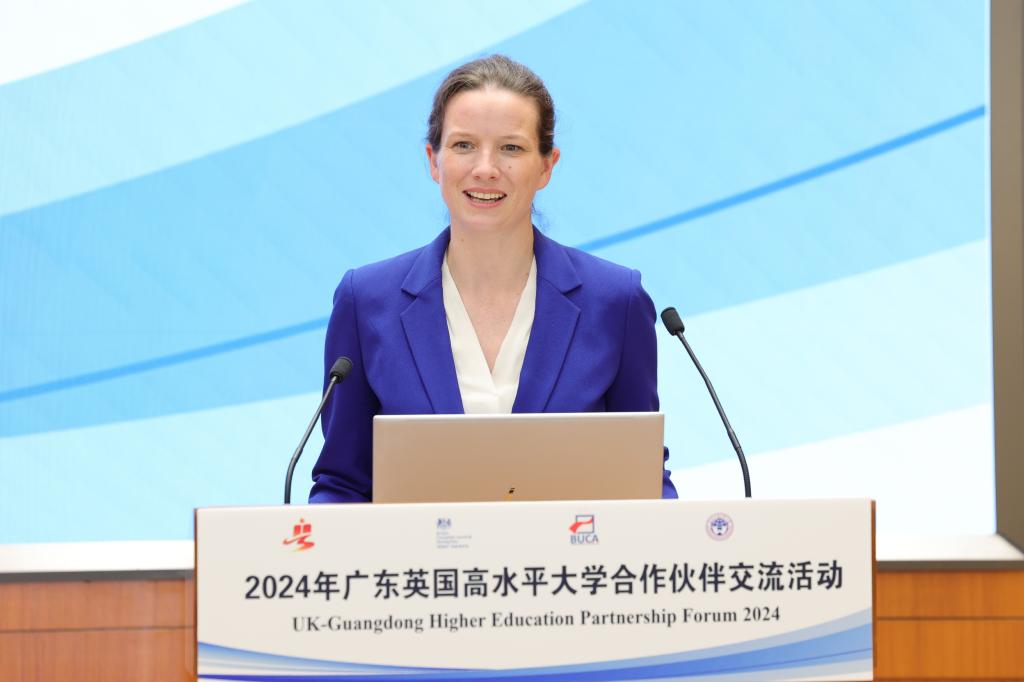 英国驻广州总领事孟诗然(Sarah Mann)在致辞中表达了对中英两国教育交流合作的期待。她表示,教育是链接不同文化、促进相互理解的桥梁,是英中关系的重要组成部分,本次活动的顺利召开为教育交流搭建了有益的平台。英中高等教育合作已在多领域开花结果,并具有广阔的前景。广东拥有独特的地理位置和开放的文化氛围,是国际教育交流中的重要窗口。她期待本次交流活动能够成为英中两国高等教育交流的新起点,助力未来教育合作达成新高度,为双方培养更多具有国际视野和竞争力的优秀人才。