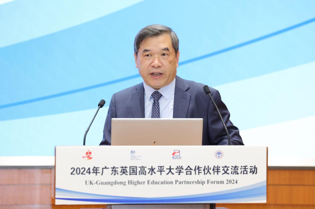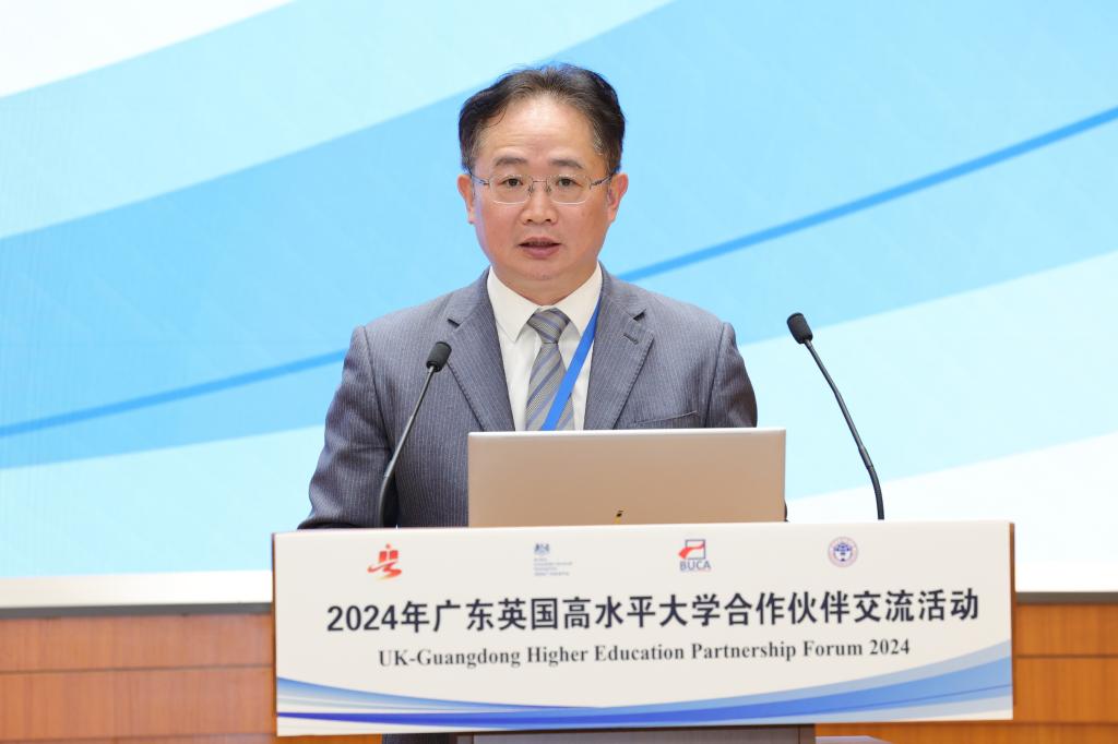 省教育厅交流合作处处长李金俊代表主办方广东省教育厅致辞。他回顾了中英两国在教育合作方面取得的丰硕成果,并指出在当前复杂多变的国际形势下,加强教育合作与政策沟通具有更加重要的意义。广东省教育厅将响应国家关于加强中欧人文交流的号召,推动广东与英国高校深入合作,共同培养更多具有国际视野的优秀人才。他深入解读了广东省教育的基本情况和对外开放政策,强调广东省将积极响应“一带一路”倡议,与世界各国加强教育交流,打造“留学中国·学在广东”的品牌;实施“教育对外开放工程”,加快推进粤港澳大湾区国际教育示范区建设,深入参与全球教育治理,持续推进高水平教育对外交流合作,探索教育对外开放的广东品牌、广东模式。他希望以此次活动为契机,促进中英高校实质性合作,为两国青年学生提供更多相互学习、共同成长的机会。
