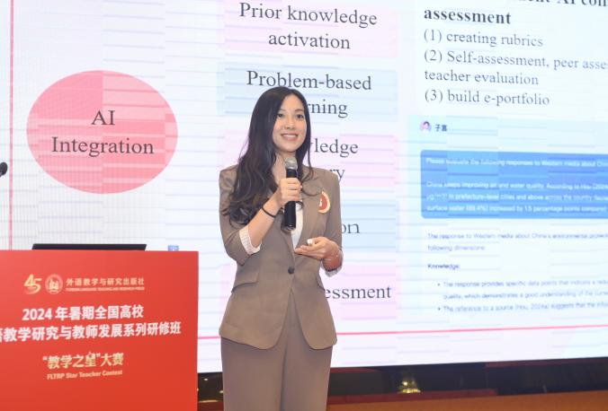 全国赛上,李敏子老师和蔡忱岑老师代表团队依托《理解当代中国英语读写教程》,聚焦生态文明建设,充分运用教育技术,为学生创设真实的互动情境,搭建任务驱动的学习支架,还原语言学习路径,反映出数智时代一线教师的创新精神与教育初心。现场问答环节中,两位老师以流利的口语和清晰的逻辑思维展现了我校英语教师专业的语言能力与思政素养,赢得了评委和观众的高度认可。