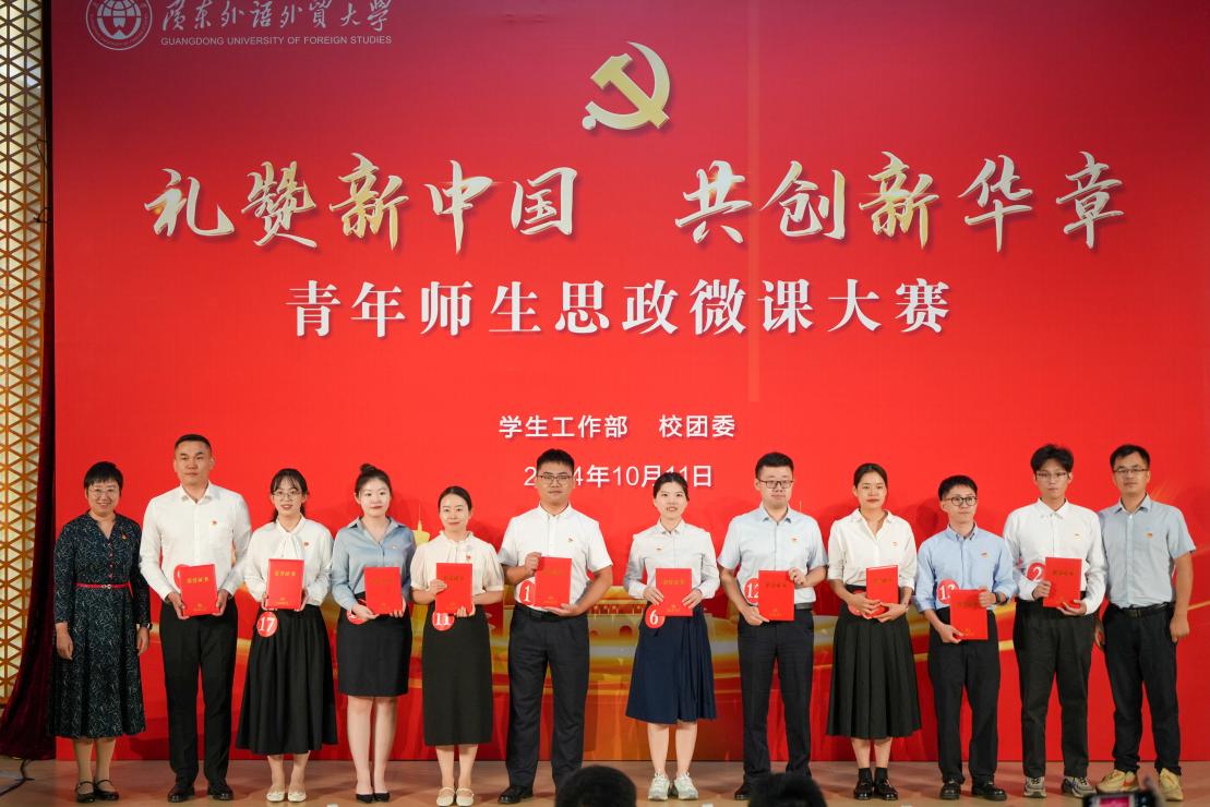 为了进一步整合青年师生的宣讲力量,加强理论武装,筑牢理想信念,汲取奋进力量,持续推动党的二十届三中全会精神落地生根、开花结果,大赛现场举行了广东外语外贸大学第二期新时代青年师生理论宣讲团成立仪式。宣讲团旨在围绕理论宣讲,推动习近平新时代中国特色社会主义思想入脑、入心、入行,做到学、思、用贯通,知、信、行统一,切实提升思政教学育人实效。