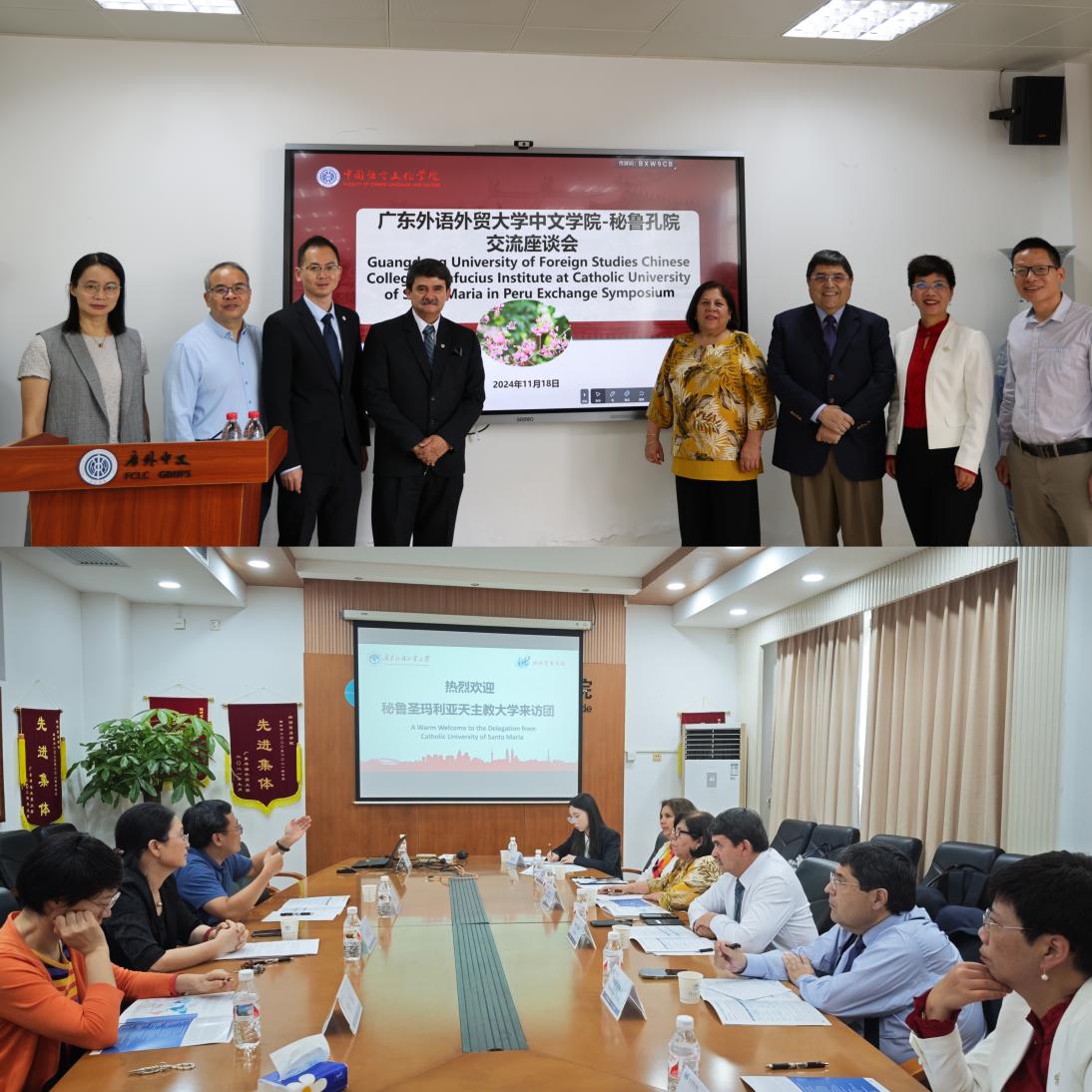 当日,秘鲁圣玛利亚天主教大学代表团还与我校中国语言文化学院和经济贸易学院相关负责人进行座谈交流,进一步就国际中文教育、专业合作共建、创新班建设、合作研究以及师生互访交流等方面进行了深入探讨。