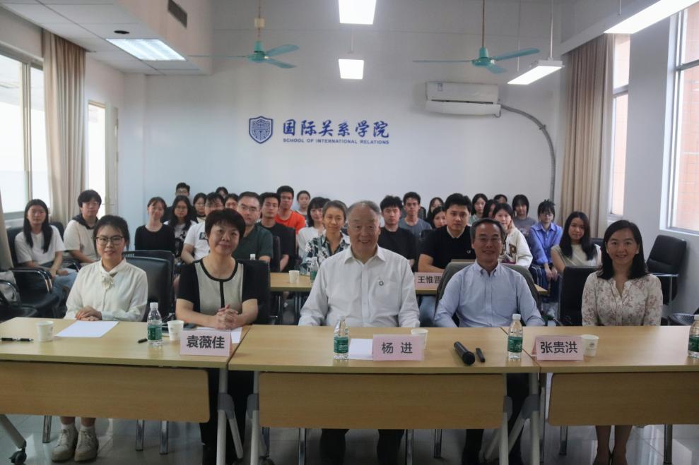 本网讯 11月18日下午,由国际关系学院主办的国关大讲堂第56讲暨我与外交官面对面第五讲在大学城校区开讲。中国常驻联合国教科文组织原大使衔代表、中国驻法国大使馆教育处原公使衔参赞、联合国教科文组织终身学习研究所理事会成员杨进大使以“全球治理中的国际组织与当代青年的国际胜任力”为题作专题讲座。讲座由我校客座教授、复旦大学联合国与国际组织研究中心主任张贵洪教授主持,国际关系学院领导与师生参加本次活动。