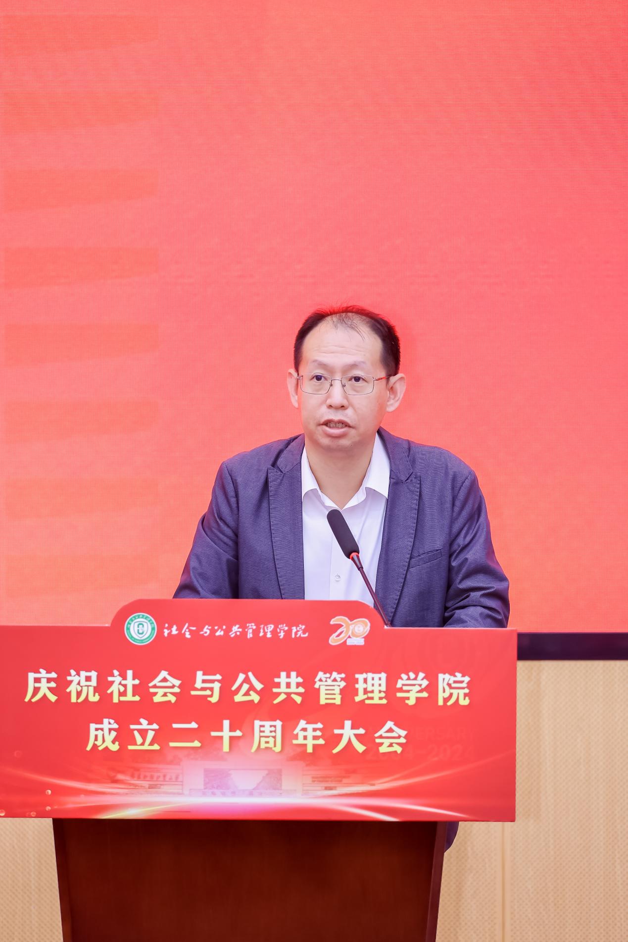 校党委常委、副校长申明浩向返校的校友和嘉宾表示诚挚欢迎,对长期心系母校、关心支持母校建设与发展的广大校友们致以衷心的感谢。他从学校发展顶层设计、学科布局、人才培养、有组织科研、国际交流合作、学校内部治理等方面介绍了学校发展近况;同时对社会与公共管理学院成立以来的发展和所取得的成绩给予充分的肯定,指出公管学院在人才培养、学科建设、科学研究、社会服务等方面勇于担当,贡献突出,最后他祝福公管学院和全体公管人百尺竿头,更进一步。