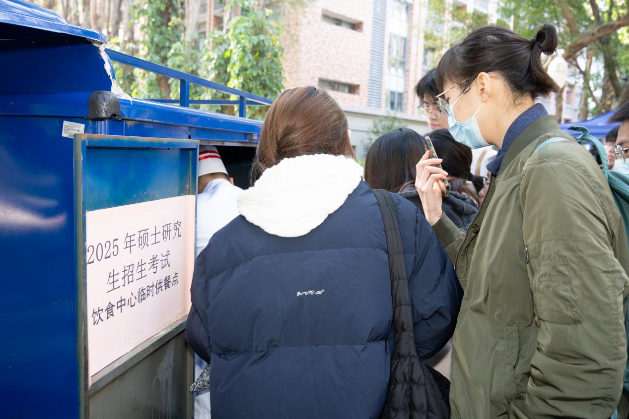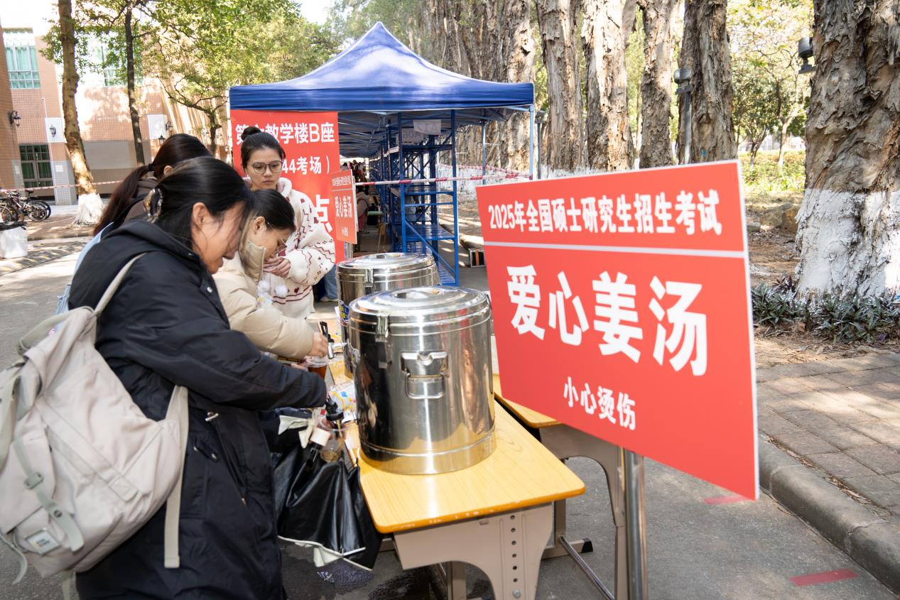 学校提前发布了研考温馨提示,内容涵盖考前准备、考场安排及考场规则、赴考指引等多个方面,方便考生熟悉考场环境,提前做好科学的赴考规划。为让考生能量满满,学校除了开放学生食堂供考生用餐和休息,还贴心设置了移动餐车,为考生提供便捷的用餐服务,更有温情满满的红糖姜汤,为考生带去丝丝暖意。考场还设置了医疗服务点,考生可按需取用口罩、消毒洗手剂、药品等医疗物资,让考生无后顾之忧。