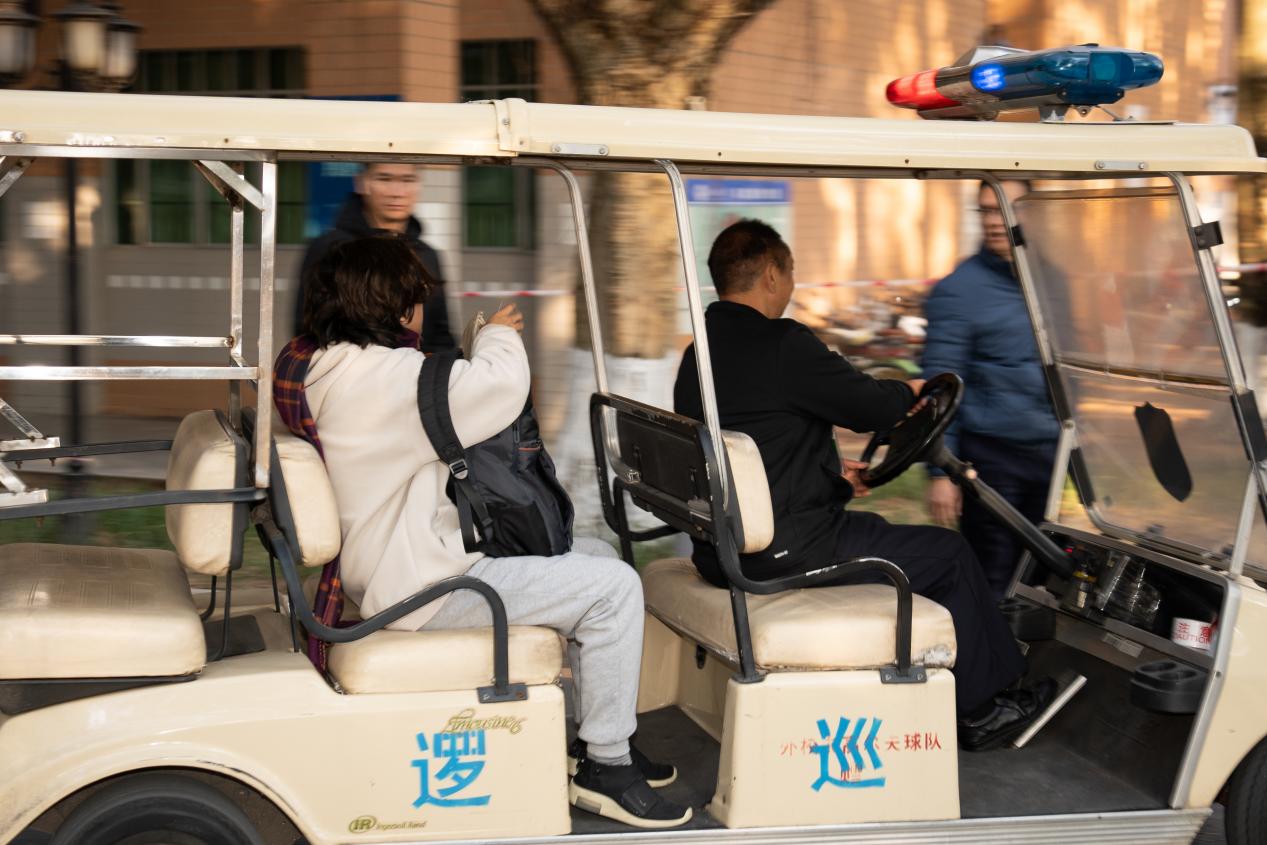 工作人员电瓶车载送匆忙赶路的考生赴考