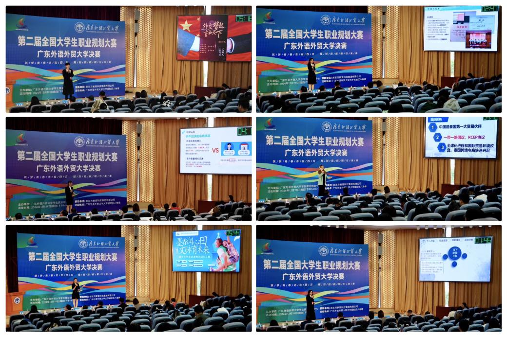 本网讯 12月19日下午,第二届全国大学生职业规划大赛广东外语外贸大学决赛于大学城校区八角楼会议室举行,16名决赛选手一展风采。学生就业创业中心和相关学院的负责人、指导老师出席本次比赛,共300多名学生现场观摩。