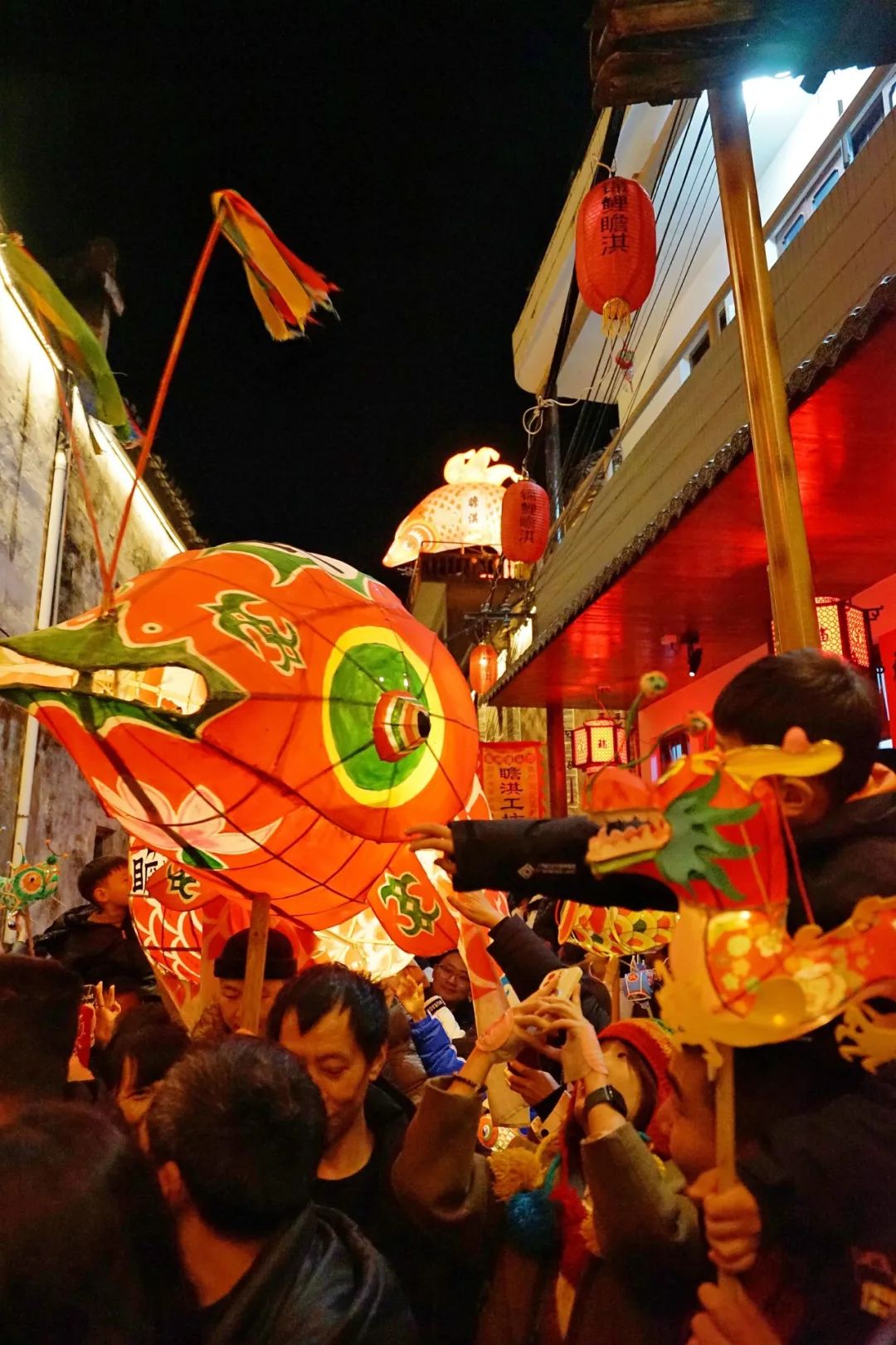 正月里,夜幕低垂,华灯初上。随着锣鼓声响彻青石板巷,六条栩栩如生的鱼灯从巷弄中游出。每条鱼灯长约四米,竹骨纸鳞在灯光映照下熠熠生辉,时而摆尾穿行于马头墙下,时而与围观游客逗趣互动。村民热情招呼:“摸摸鱼头,万事不愁;摸摸鱼尾,顺风顺水!”游客们仿佛走进了辛弃疾的诗词中,纷纷举起手机记录这流动的非遗画卷——这里没有舞台界限,每个人都是传统文化活动的参与者。