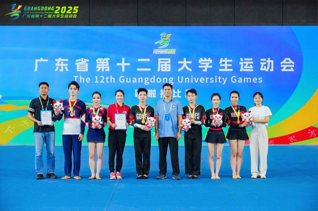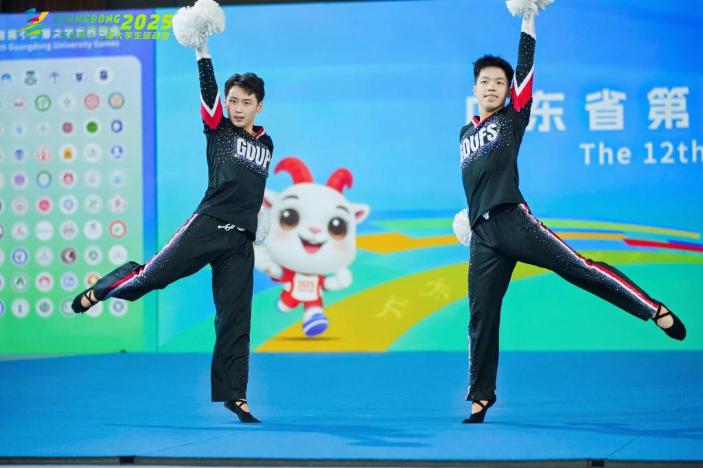 这是 2025 年广东省第十二届大学生运动会啦啦操项目的决赛现场,来自广东外语外贸大学艺术学院的张诚、柳熠两位选手一路过关斩将,最终摘得双人花球项目冠军,为广外夺得本届大运会首枚金牌。