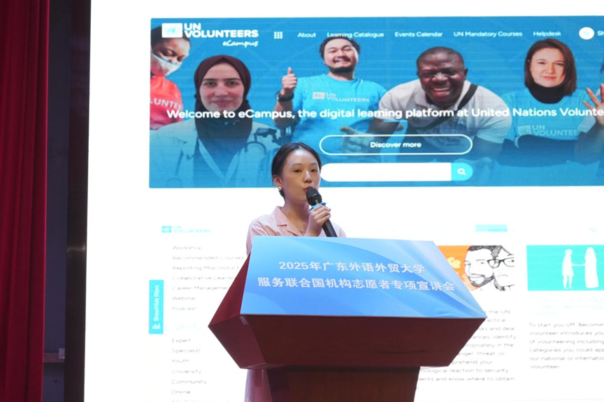 宣讲会由大使团成员帕提玛主持。在嘉宾分享环节,两位曾参与联合国志愿服务的广外学子分享了他们的经历与感悟。亚非语言文化学院研究生刘珊珊作为国际大学生志愿者代表,曾担任联合国毒品与犯罪办公室南亚区域办事处宣传与传播助理。结合在尼泊尔的跨文化工作经历,刘珊珊同学讲述了如何通过语言能力和文化理解推动项目落地。她提到,在参与尼泊尔“RiseUp4Peace”项目时,通过调整项目切入点、倾听当地需求,成功将中国“因材施教”理念融入国际实践,展现了广外青年“会语言、懂世界”的素养。