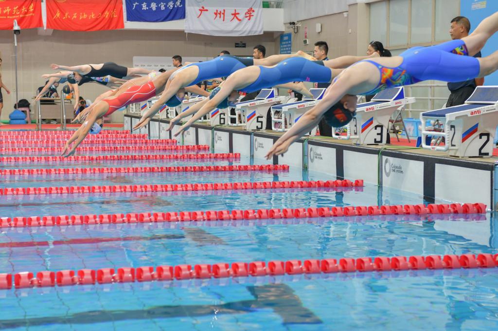 这是本届大运会女子甲组4×50米混合泳接力决赛现场,由谭炜君、陈佳楠、欧泳诗、高樱睿组成的广东外语外贸大学代表队,以绝对优势摘得桂冠,助力广外实现该项目的卫冕,并刷新赛会纪录超5秒。