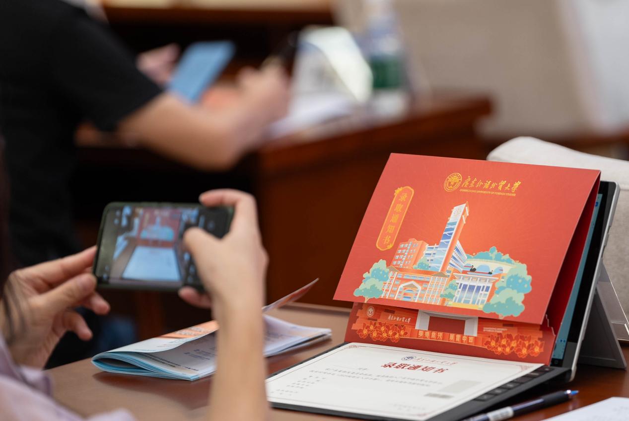 会上,广外2025年录取通知书正式亮相。申明浩介绍,录取通知书整体采用中国传统的红色作为主色调,象征着喜庆、热情和希望,同时运用现代化的插画风格和排版设计,体现了学校传承与创新并重的理念。在录取通知书的背面,扫描二维码,新生将跟随校庆吉祥物云宝,以沉浸式、交互式的形式体验一场“跨越时空、共筑梦想”的广外60载荣耀之旅。