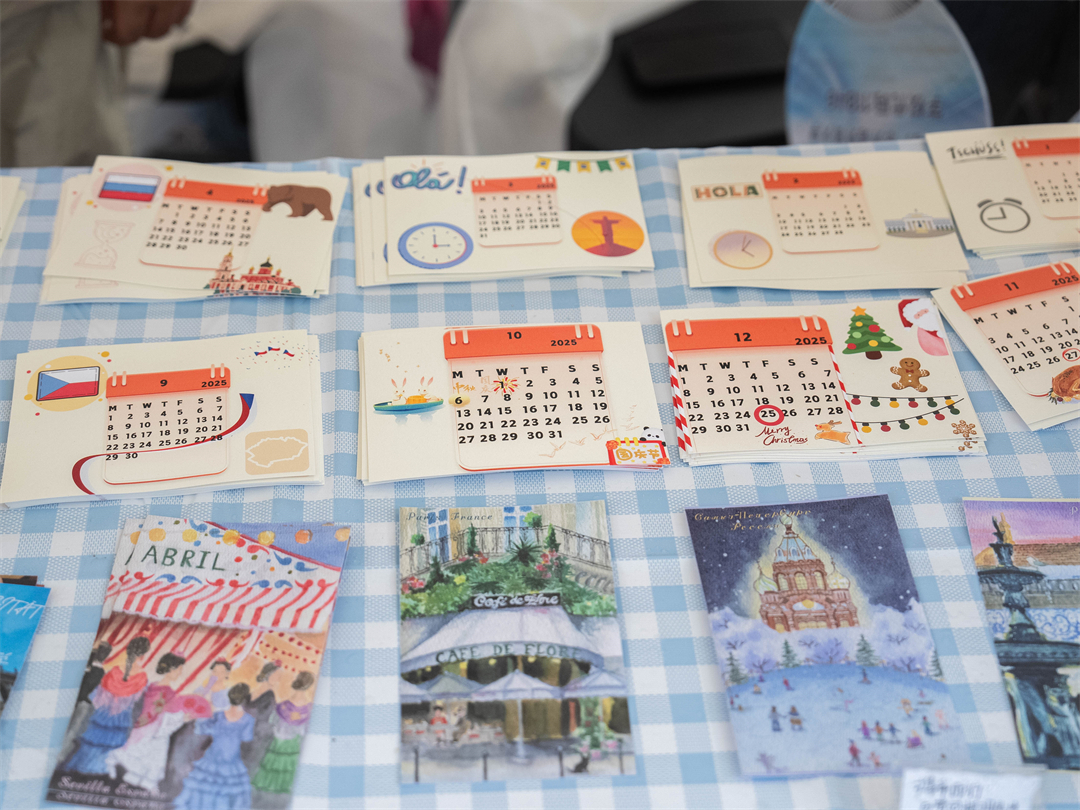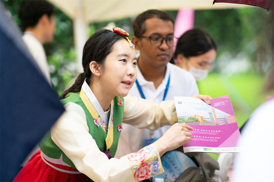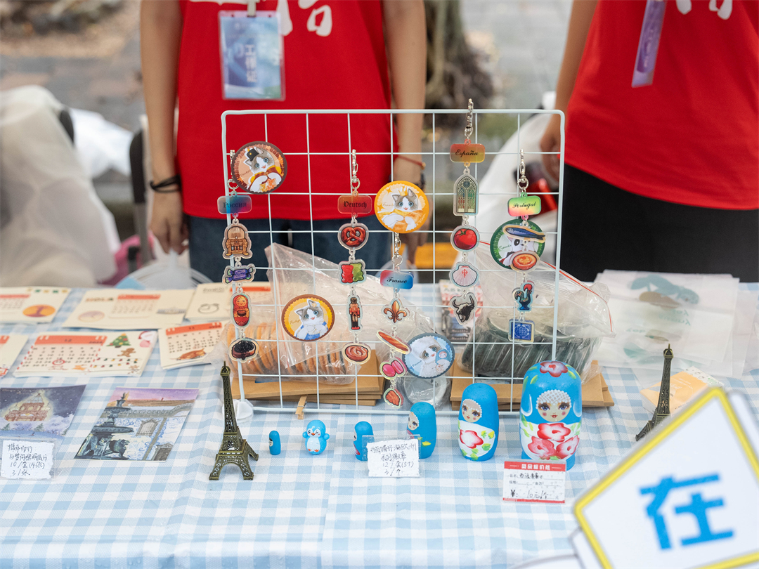 与此同时,“环球风味,人文广外”活动在文化广场上热闹非凡。印着广外英文缩写“GDUFS”字样的精美徽章、明信片、冰箱贴等琳琅满目;由广外人打造的原创IP“小外”也以其可爱呆萌的形象吸引了不少考生和家长。东南亚学院(东南亚研究院)结合文化特色推出了泰国剪纸花和猜字谜游戏,帮助考生和家长更好地了解东南亚地区的文化;中国语言文化学院摊位前,中文学子身着汉服,一幅幅水墨丹青迎风飘扬,尽显中文魅力与诗意;区域国别学院摊位前,金黄酥脆的意大利风味千层酥层层叠叠,细腻的糖霜吸引了不少人前来品尝。一位来自中山的考生兴奋地谈到,广外的校园文化特别丰富,让她感受到了多元文化的魅力,她希望能有机会在广外学习,体验开放包容的文化。