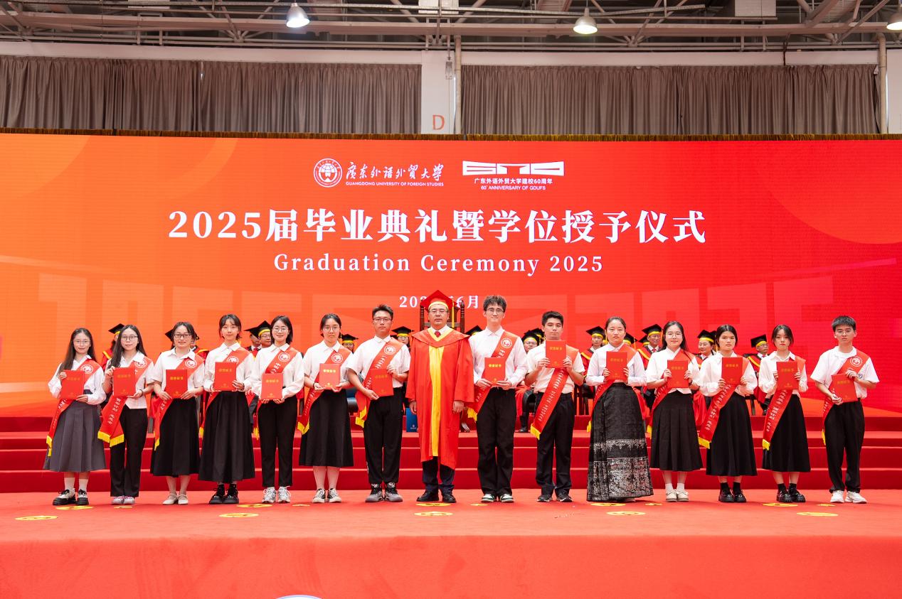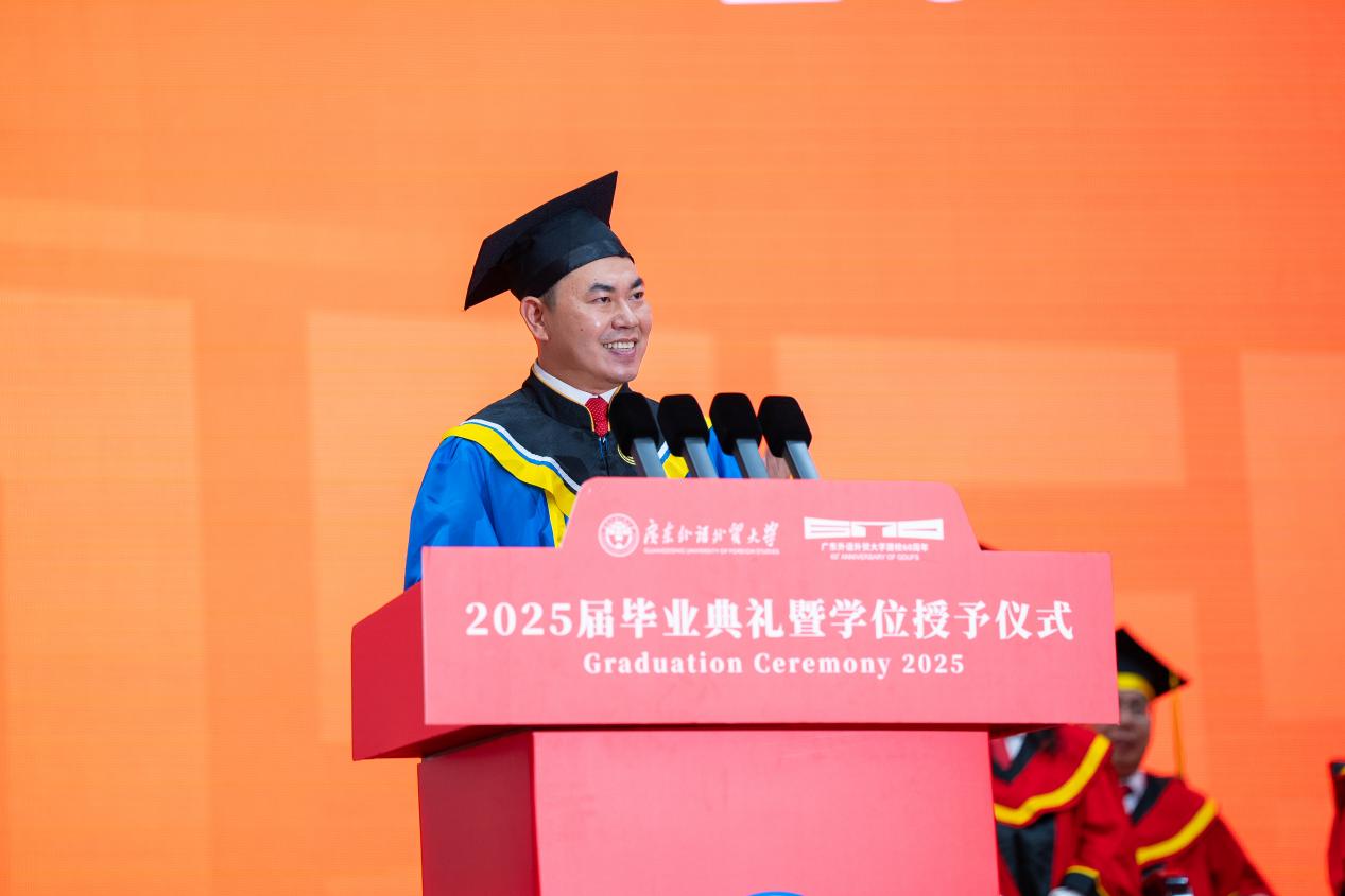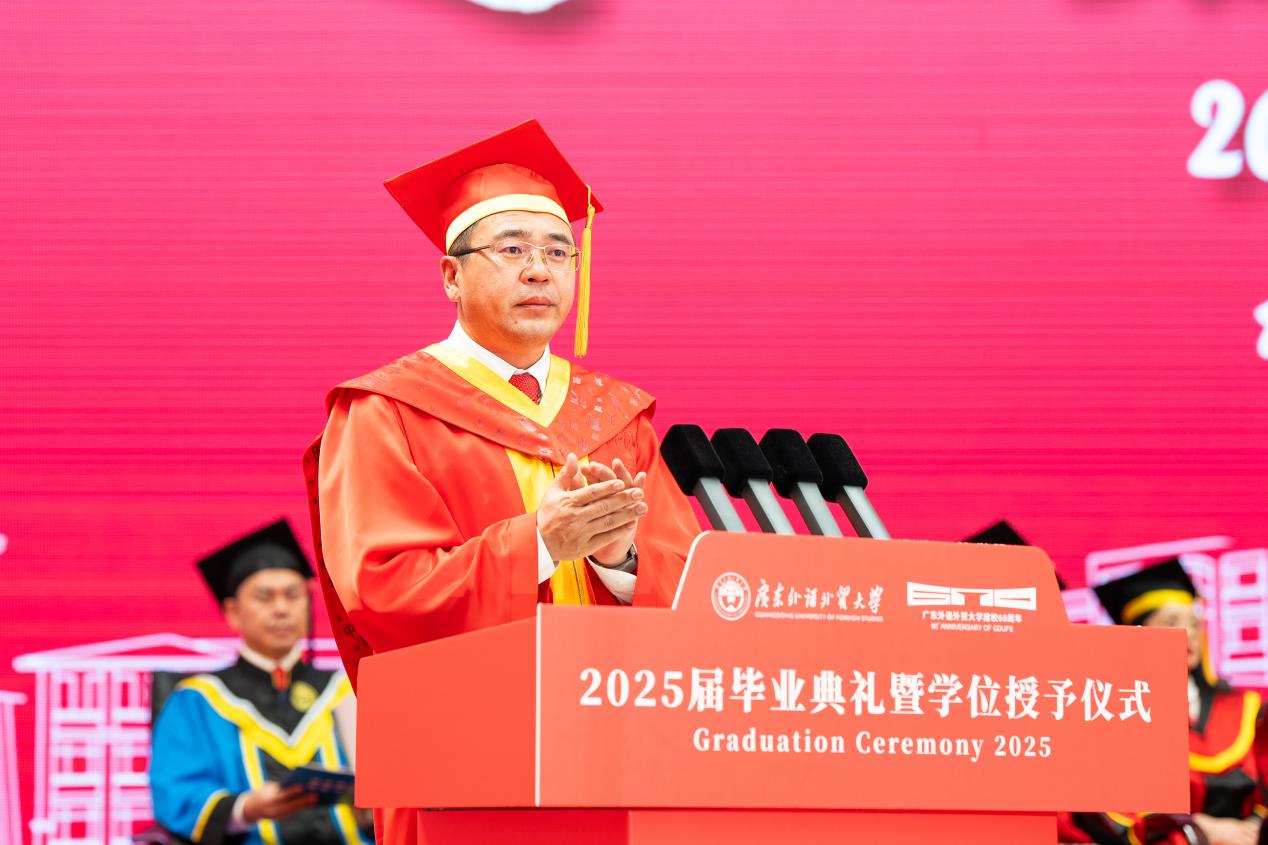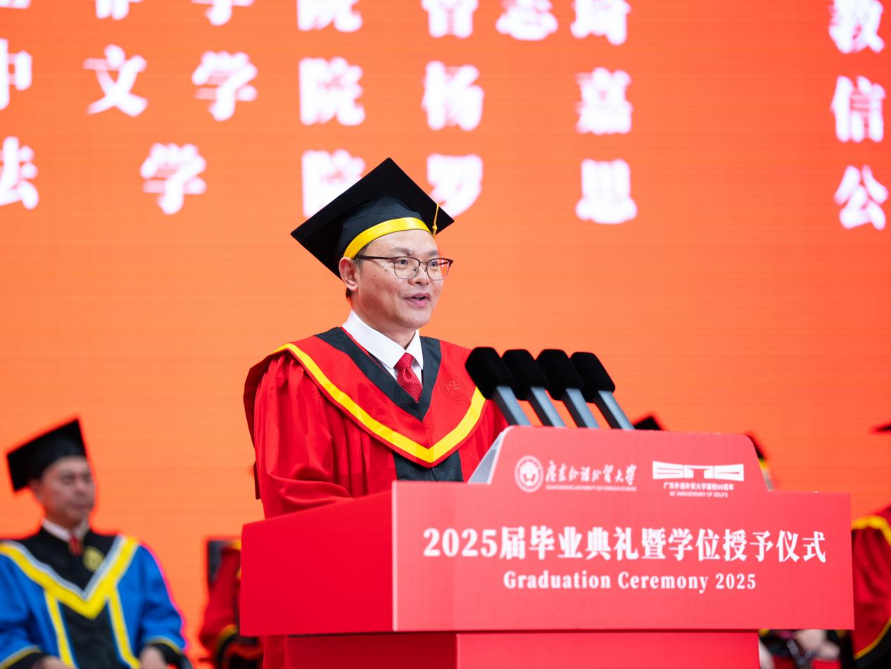 把握脚下路,方能勇立潮头。闫相斌勉励毕业生们深刻理解所处的历史方位,认清机遇与挑战,才能校准方向,砥砺前行。他表示,你们脚下的路通向强国伟业,这是你们施展才华的人生主场。广外已为你们铺就成长的道路,远方需要你们自己迈开脚步,向人生目标迈进,与国家需求同频,跟时代脉搏呼应。你们脚下的路穿越百年变局,这是你们探索未来的全新征途。只要你们秉持广外人敢为人先的闯劲、永不服输的韧劲、善作善成的干劲,就一定能够在风浪中找到新航道,在变局中闯出新天地。你们脚下的路伴随科技浪潮,这是你们自我突破的重要赛道。唯有保持终身学习的毅力,提高拥抱变革的勇气,迈开跨界融合的步伐,用语言能力衔接技术工具,用人文思维驾驭算法逻辑,才能在数字赛道上掌握主动、驰骋未来。