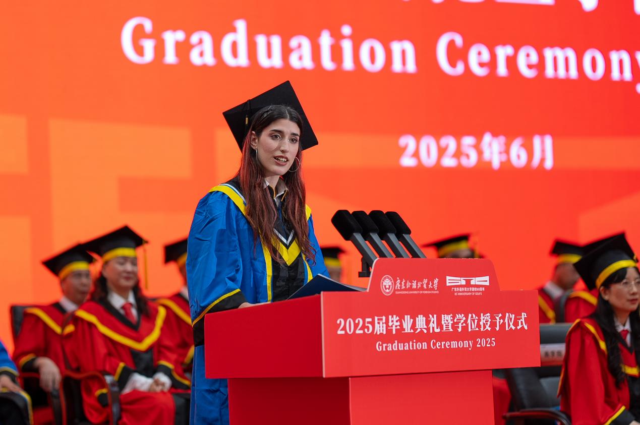 毕业生代表、来自塞尔维亚的国际商务(全英教学)本科专业留学生多斯塔纳向母校、老师、同学、家人表达了感激之情。她表示,在广外的求学旅程中,自己主动跨出舒适圈,勇敢面对各种挑战,感恩广外的包容与温暖支撑着自己一路成长,不断成为更好的自己。