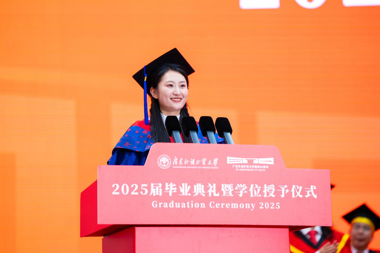 毕业生代表、东南亚学院(东南亚研究院)本科毕业生刘海霞回忆起自己在广外的成长历程与奋斗足迹。她表示,坚信母校所赋予广外学子的精神和力量,在今后的岗位上,会始终铭记“明德尚行,学贯中西”的校训,带着广外人特有的精神底色,为社会发展贡献自己的力量。